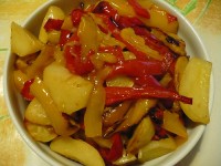 1. Pulire i peperoni, togliere i semi e le nervature bianche. 2. Tagliare a pezzi larghi circa due centimetri. 3. Sbucciare lo scalogno e tagliarlo a pezzi. 4. Sbucciare le patate, tagliarle a spicchi di due centimentri e metterle in una bacinella piena d’acqua. 5. Mettere in una padella antiaderente i peperoni, lo scalogno, il peperoncino a pezzetti, un cucchiaio di olio extra vergine d’oliva, poco sale. Coprire e fare appassire a fuoco basso. 6. Toglierli dalla padella a cottura ultimata e tenerli in caldo. 7. Togliere le patate dall’acqua ed asciugarle bene. 8. Mettere le patate nella padella dove sono stati cotti i peperoni con un cucchiaio di olio extra vergine d’oliva e farle rosolare a fuoco vivace per circa 10 minuti. Salare poco. 9. A cottura ultimata unire i peperoni e farli saltare assieme per 2 minuti. 10. Poco prima di servirli, spolverizzare di prezzemolo tritato e di origano gresco. 11. Servire caldi.