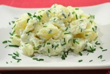 1. Mettere sul fuoco una pentola piena d’acqua e due foglie di alloro. 2. Pelare le patate. 3. Cuocere le patate in acqua bollente per 10/15 minuti. (La cottura dipende dalla grandezza delle patate. Prima di toglierle dal fuoco sentire se i rebbi di una forchetta entrano con facilità). 4. Scolarle e farle raffreddare. 5. Mettere lo yogurt in una ciotola, unire un cucchiaio di erba cipollina, lo scalogno e il mezzo gambo di sedano tagliati sottili, un cucchiaio di olio extra vergine d’oliva e il cucchiaino di curry. 6. Girare bene. 7. Tagliare a fette non troppo sottili le patate fredde e condirle con la salsa di yogurt.
