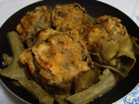 Per sei persone Sei carciofi romaneschi 120 g di soia in granuli Tre cucchiai di farina Mezzo bicchiere di latte magro Due spicchi d’aglio Un mazzetto di prezzemolo Qualche foglia di menta Tre cucchiai di olio extra vergine d’oliva Un bicchiere di vino bianco Un limone