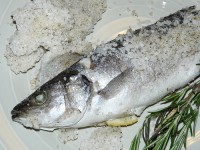 1. Lavare le fette di salmone, asciugarle e sistemarle in un pirex da portare a tavola. 2. Mettere tra la pelle e la carne del pesce alcune foglie di alloro e qualche grano di pepe. 3. Coprire con il sale grosso fino a formare una piccola cupola. 4. Infornare a forno caldo (200°) e cuocere 20 minuti. 5. Portare in tavola, spaccare la crosta di sale e servire.