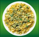 Per 6 persone 500 g di farfalle 70 g di mandorle pelate 30 g di gherigli di noce Noce moscata grattugiata al momento 1 punta di cannella Alcune foglie di basilico 2 cucchiai di olio extra vergine d’oliva 2 cucchiai di latte magro